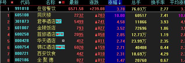 具體看,截至8月26日上午收盤,住宿餐飲板塊走強,漲幅居首,達3.78%。其中,同慶樓報收于漲停,君亭酒店、金陵飯店、華天酒店、首旅酒店、錦江酒店等個股漲幅均超2%。