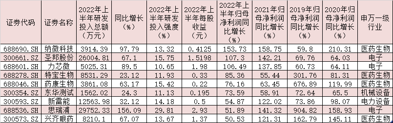 表:今年上半年研發(fā)投入強度超10%且2019年、2020年、2021年、2022年上半年歸母凈利潤同比增長均超50%的公司