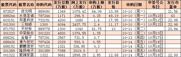表:下周(10月10日-14日)11只新股發(fā)行情況:
