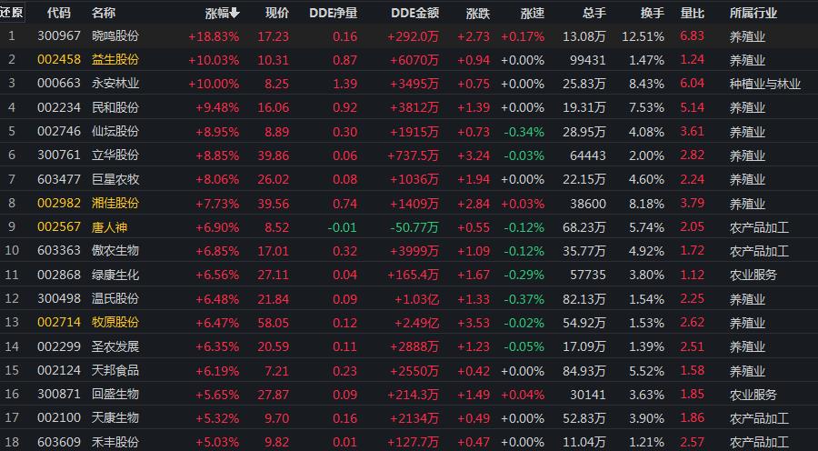 10月10日,農(nóng)林牧漁行業(yè)漲幅居首,達(dá)3.35%。其中,曉鳴股份漲幅居首達(dá)18.83%,益生股份和永安林業(yè)等2只農(nóng)業(yè)股聯(lián)袂漲停。