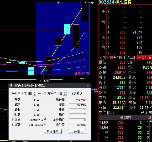 10月10日,熱門股棒杰股份再度漲停,截至收盤,報(bào)7.36元,實(shí)現(xiàn)6連漲,其中,有3個(gè)交易日漲停,6個(gè)交易日累計(jì)漲幅達(dá)42.91%。