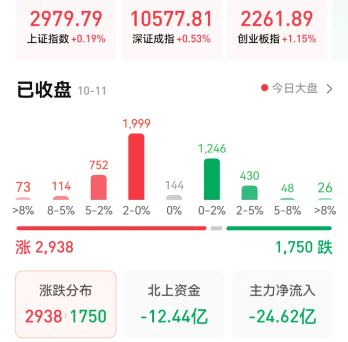 周二(10月11日),A股三大指數(shù)集體收漲。截至收盤(pán),上證指數(shù)漲0.19%報(bào)2979.79點(diǎn),深證成指漲0.53%報(bào)10577.81點(diǎn),創(chuàng)業(yè)板指漲1.15%報(bào)2261.89點(diǎn);兩市合計(jì)成交5638億元,北向資金凈賣(mài)出12.44億元。總體來(lái)看,A股個(gè)股漲多跌少。