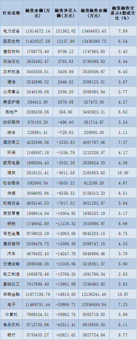 表:10月14日申萬一級(jí)行業(yè)兩融交易情況: