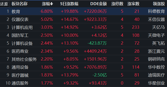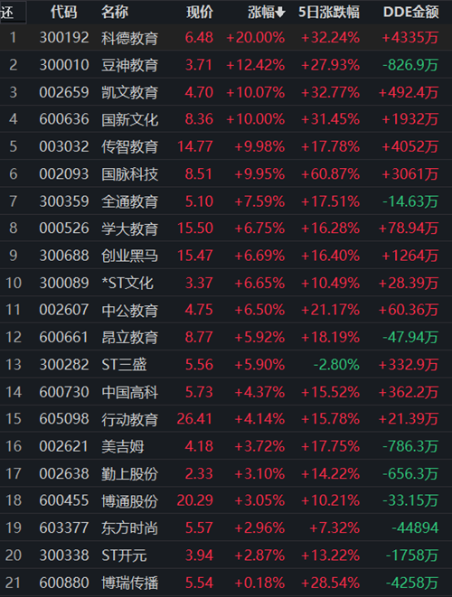 從漲幅居首的教育行業(yè)看,截至10月17日11:30,該行業(yè)交易的21只個(gè)股全線上漲,其中13只漲幅超5%。從資金流向看,該行業(yè)今天上午大單資金凈流入額達(dá)7220.06萬元,居行業(yè)第5位。