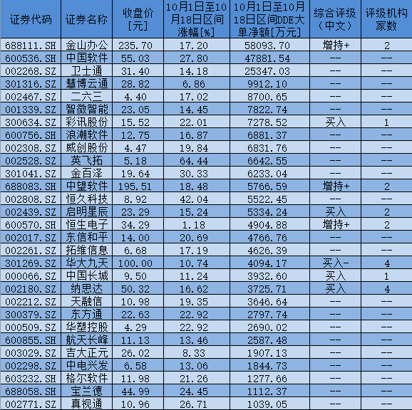 表:10月份以來,截至10月18日,獲大單資金凈流入額超1000萬元的信創(chuàng)概念股一覽