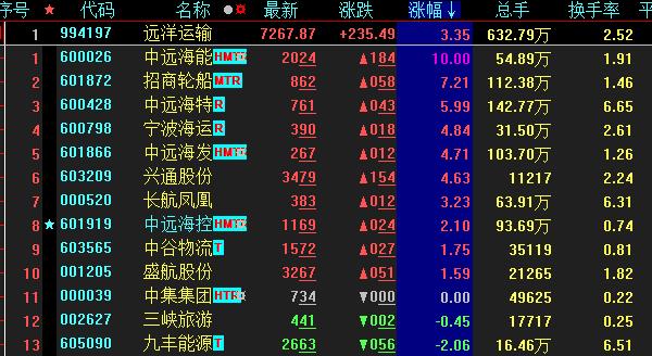 具體看,截至10月19日上午收盤,遠洋運輸板塊漲幅達3.35%,其中,中遠海能漲停,緊隨其后的是招商輪船漲幅達7.21%。