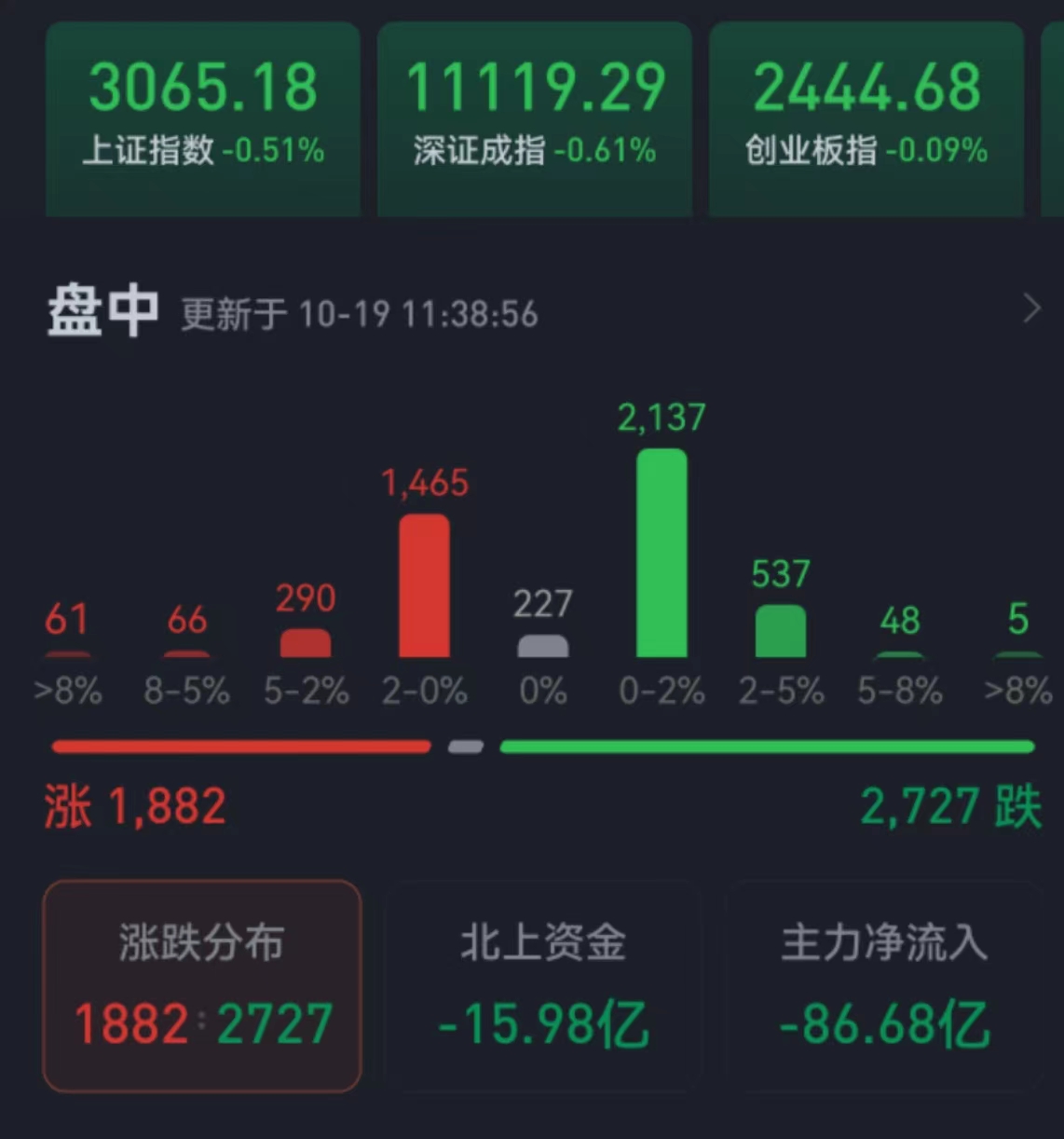 周三(10月19日),三大股指震蕩回落。截至上午收盤,上證指數跌0.51%,報3065.18點;深證成指和創(chuàng)業(yè)板指分別下跌0.61%和0.09%;滬深兩市合計成交額4679.6億元,總體來看,兩市個股跌多漲少。