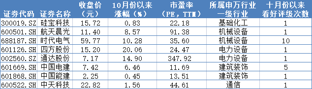 10月份以來,上述82只個股,8只個股被機構(gòu)給予“買入”或“推薦”看好評級,其中時代電氣獲看好評級10次,中國電建獲看好評級5次。月內(nèi),6家公司接受機構(gòu)調(diào)研,時代電氣、亨通光電、金田股份被調(diào)研次數(shù)均超30次。