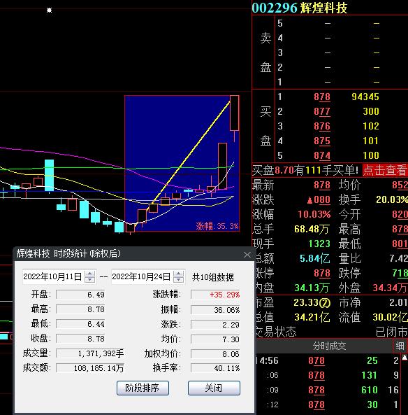 10月24日,熱門股輝煌科技再度漲停,截至收盤,報8.78元,連續(xù)2個交易日漲停,實(shí)現(xiàn)十連漲,期間累計漲幅達(dá)35.29%。