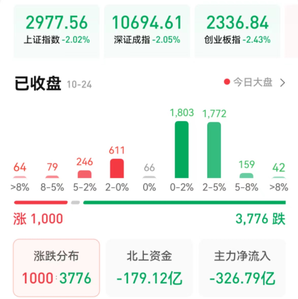 周一(10月24日),A股三大指數(shù)集體收跌,跌幅均超2%。截至收盤,上證指數(shù)報2977.56點(diǎn)失守3000點(diǎn),跌幅2.02%;深證成指報10694.61點(diǎn),跌幅2.05%;創(chuàng)業(yè)板指報2336.84點(diǎn),跌幅2.43%。滬深兩市合計成交額8810億元;北向資金凈賣出179.12億元;總體來看,A股個股跌多漲少。