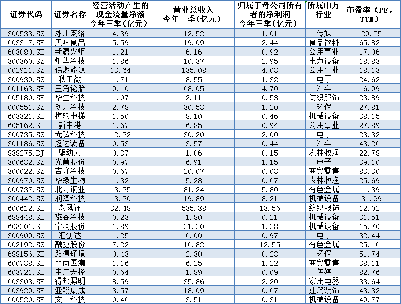 數(shù)據(jù)顯示,有4973家A股公司披露三季報,在剔除金融及非銀金融公司數(shù)據(jù)后,合計產(chǎn)生經(jīng)營活動現(xiàn)金流32471.11億元,相較于去年同期28236.34億元,同比增長15%,另外今年前三季度3144家上市公司經(jīng)營活動現(xiàn)金流呈凈流入。這從整體上反映出A股上市企業(yè)經(jīng)營活動的創(chuàng)現(xiàn)能力強(qiáng),凈利潤質(zhì)量高,應(yīng)收賬款管理較好。