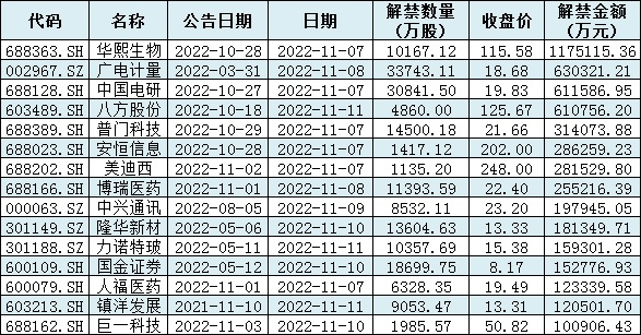 表:下周(11月7日-11日)解禁金額超10億元的公司情況: