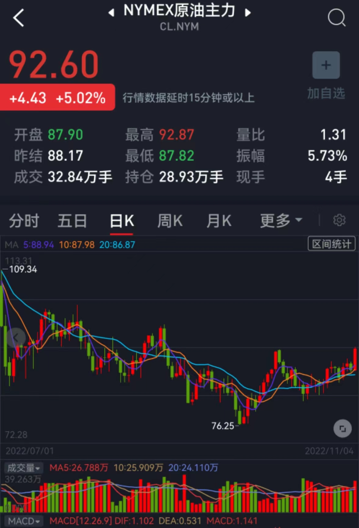 周五,國(guó)際油價(jià)全線上漲,美油12月合約漲5.02%,報(bào)92.60美元/桶。布油明年1月合約漲4.31%,報(bào)98.75美元/桶。本周,美油12月合約漲5.35%,布油明年1月合約漲5.31%。