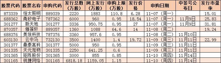 根據(jù)發(fā)行安排,下周(11月7日-11日),將有10只新股發(fā)行,其中創(chuàng)業(yè)板有5只。11月7日發(fā)行的是恒太照明、甬矽電子、新天地;11月8日發(fā)行的是雅葆軒、美??萍迹?1月9日發(fā)行的是云中馬、鼎泰高科、天元寵物;11月10日發(fā)行的是矩陣股份、銳捷網(wǎng)絡(luò)。此外,下周將有2只新股首發(fā)上市,耐科裝備、華廈眼科均于11月7日上市。