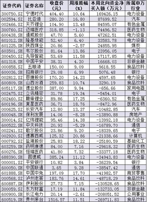 資金方面,周五,北向資金大幅凈買入99.93億元,創(chuàng)9月9日以來(lái)新高。本周北向資金累計(jì)凈賣出金額達(dá)50.11億元。從前十大成交活躍股來(lái)看,本周,寧德時(shí)代、比亞迪、天齊鋰業(yè)、邁瑞醫(yī)療等4只個(gè)股,北向資金凈買入金額均超7億元。另外,貴州茅臺(tái)、長(zhǎng)江電力、東方財(cái)富、伊利股份等個(gè)股遭北向資金凈賣出金額均超10億元。