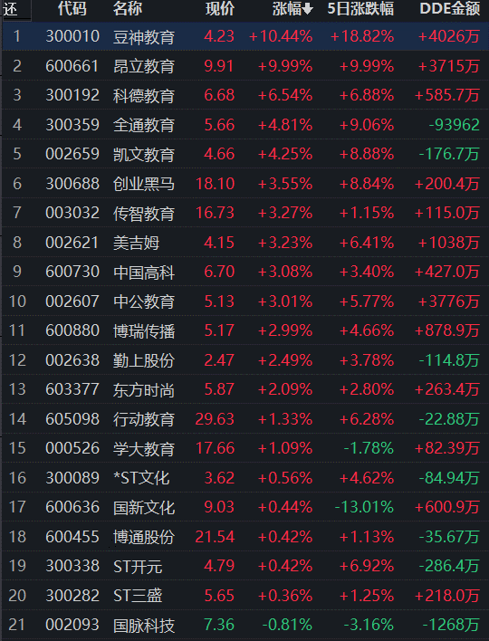 從早盤表現(xiàn)強勢的教育行業(yè)看,截至11月16日11:30,該行業(yè)交易中的21只個股有20只上漲,其中3只漲幅超5%。從資金流向看,該行業(yè)今天上午大單資金凈流入額達1.39億元,居行業(yè)第8位。