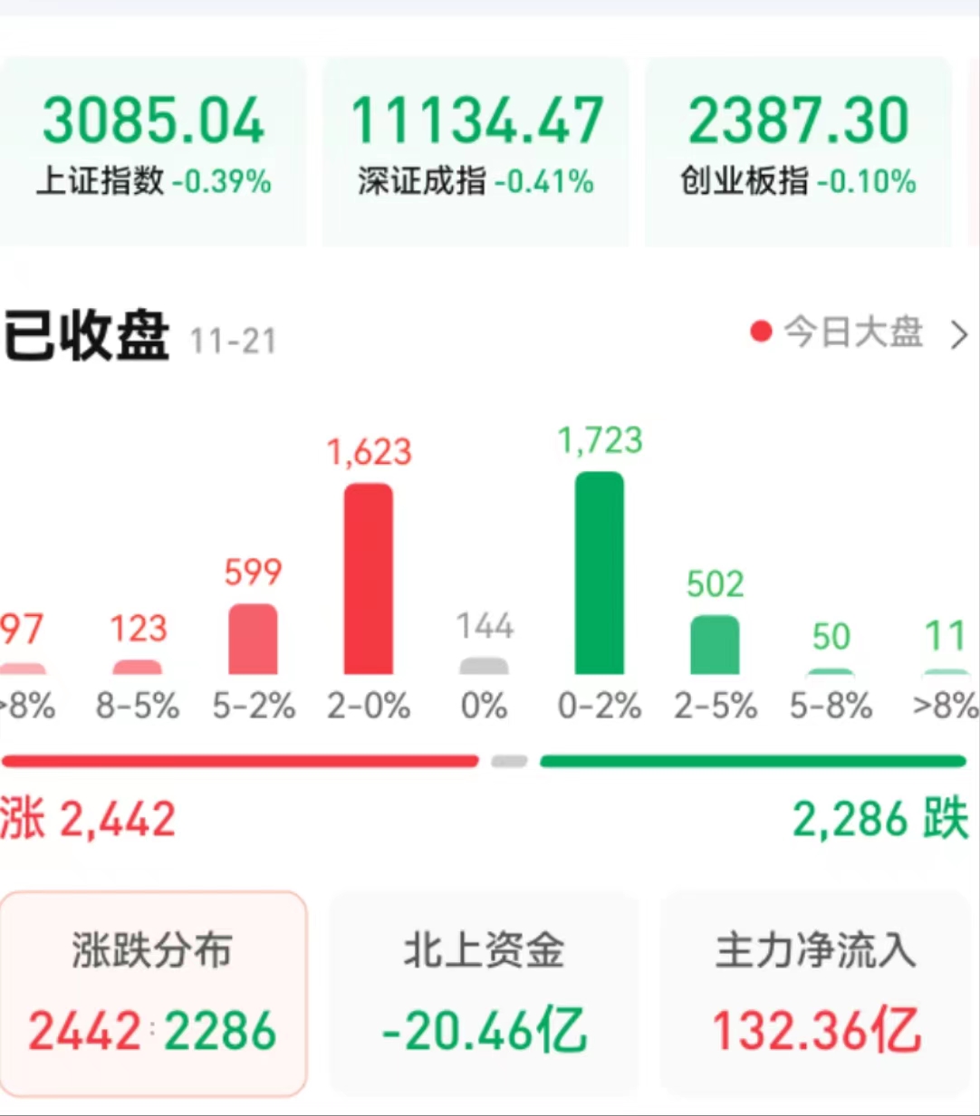 周一(11月21日),A股三大指數(shù)震蕩走弱。截至收盤,上證指數(shù)跌0.39%報(bào)3085.04點(diǎn),深證成指跌0.41%報(bào)11134.47點(diǎn),創(chuàng)業(yè)板指跌0.1%報(bào)2387.3點(diǎn),北證50指數(shù)漲2.55%;兩市合計(jì)成交額8492億元,北向資金凈賣出20.46億元??傮w來(lái)看,兩市個(gè)股漲多跌少。
