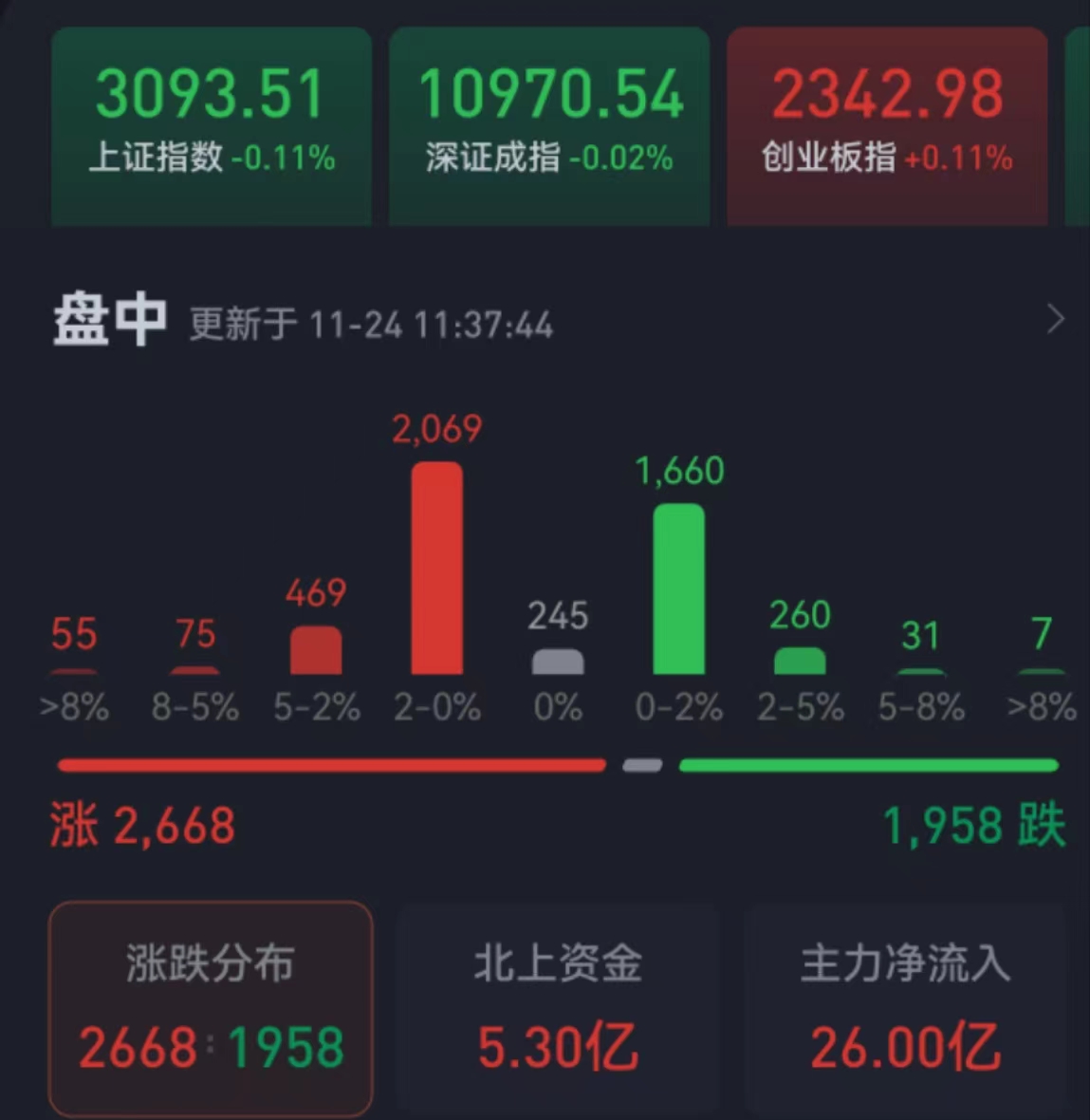 周四(11月24日),三大股指沖高后,震蕩分化,漲跌不一。截至上午收盤,上證指數(shù)跌幅達(dá)0.11%,報3093.51點(diǎn);深證成指跌幅為0.02%,創(chuàng)業(yè)板指漲幅為0.11%;滬深兩市合計成交額4730.94億元,總體來看,兩市個股漲多跌少。