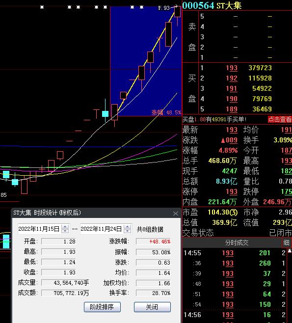 11月24日,熱門股ST大集漲停,截至收盤,報(bào)1.93元,連續(xù)8個(gè)交易日實(shí)現(xiàn)上漲,期間累計(jì)漲幅達(dá)48.46%??梢钥吹?,ST大集自11月1日開始啟動(dòng)后,連續(xù)攀升,月內(nèi)累計(jì)漲幅達(dá)112.09%。