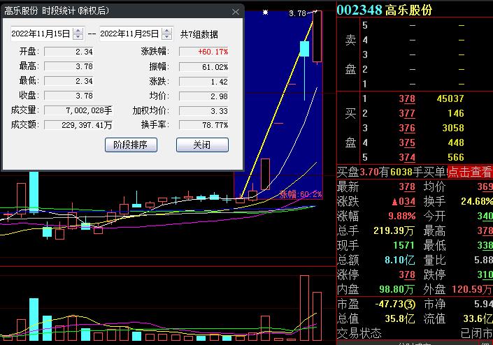11月25日,高樂(lè)股份漲停,截至收盤(pán),報(bào)3.78元,連續(xù)7個(gè)交易日實(shí)現(xiàn)上漲,期間累計(jì)漲幅達(dá)60.17%。
