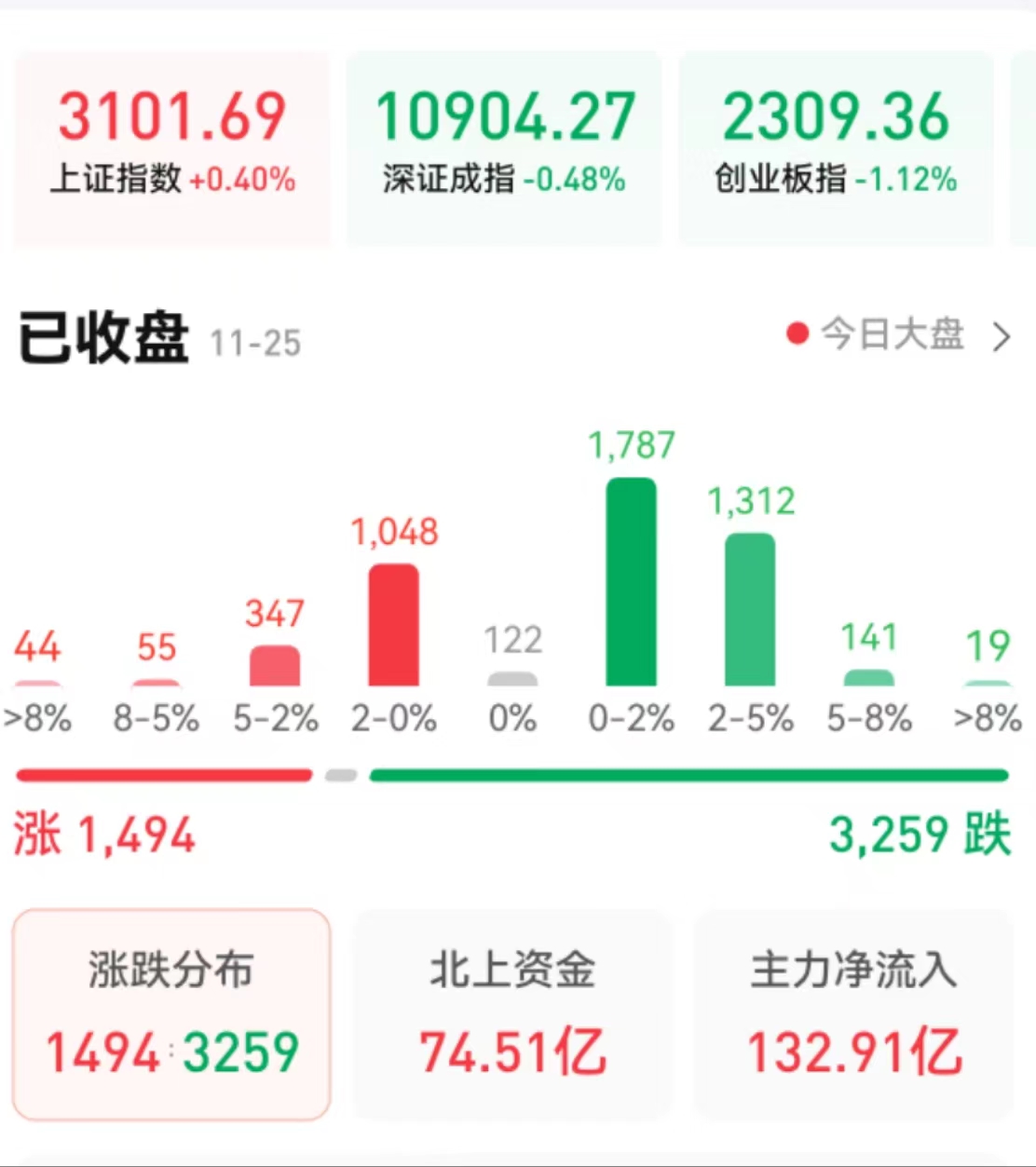 周五(11月25日),A股三大股指縮量震蕩,走勢(shì)分化。值得關(guān)注的是,上證指數(shù)微漲0.4%報(bào)3101.69點(diǎn),重新站上3100點(diǎn)整數(shù)關(guān)口;深證成指跌0.48%報(bào)10904.27點(diǎn);創(chuàng)業(yè)板指跌1.12%報(bào)2309.36點(diǎn)。兩市合計(jì)成交7399億元,北向資金凈買(mǎi)入74.51億元。房地產(chǎn)行業(yè)飆漲近5%,10只地產(chǎn)股攜手漲停??傮w來(lái)看,兩市個(gè)股跌多漲少。