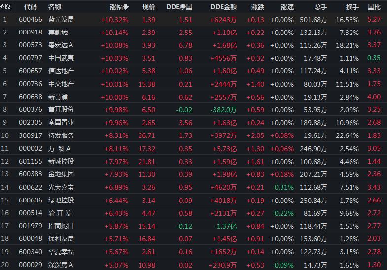 11月25日,房地產(chǎn)行業(yè)漲幅居首,達(dá)4.68%。其中,首開(kāi)股份、ST泰禾、中交地產(chǎn)、中國(guó)武夷、藍(lán)光發(fā)展、新黃浦、信達(dá)地產(chǎn)、粵宏遠(yuǎn)A、嘉凱城、南國(guó)置業(yè)等10只地產(chǎn)股集體漲停。
