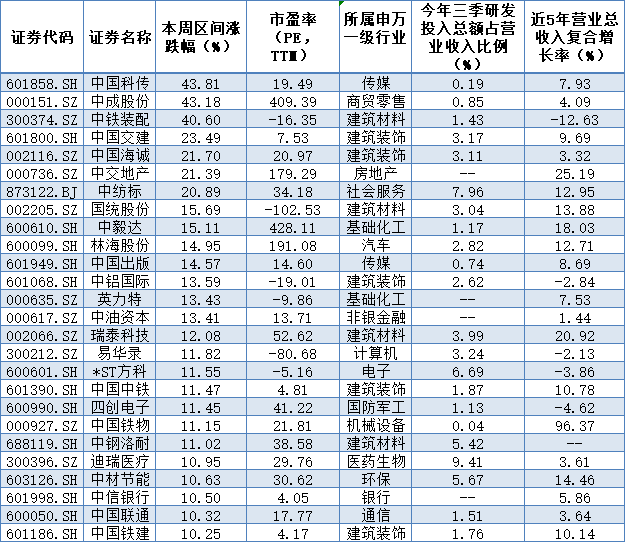 本周,中字頭概念下113只個股,82只實現(xiàn)上漲,其中包括77家央企;中國科傳、中成股份、中鐵裝配累計漲幅超40%;另外,中國平安、中國電建、中國建筑和中國中免也獲得北上資金青睞,分別有5.03億元、1.85億元、1.50億元和1.08億元的凈買入額。