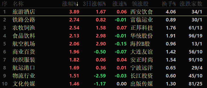 東方財富行業(yè)方面,截至12月13日11:30,86類行業(yè)中39類上漲,占比45.35%,其中,旅游酒店行業(yè)漲幅居首,達3.89%,鐵路公路和農(nóng)牧飼漁等行業(yè)緊隨其后。醫(yī)療器械行業(yè)跌幅居首,達2.58%。