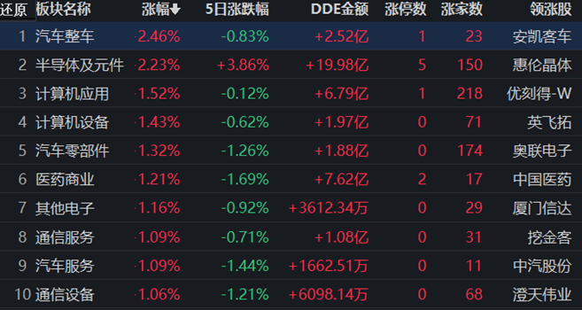 同花順行業(yè)方面,截至12月15日11:30,76類行業(yè)中34類上漲,占比44.74%,其中,汽車整車行業(yè)漲幅居首,達(dá)2.46%,此外,半導(dǎo)體及元件漲幅超2%。貴金屬跌幅居首,達(dá)2.61%。
