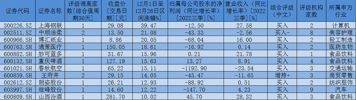 從市場表現(xiàn)來看,12月份(12月1日至12月26日),上述76只獲得調(diào)高評(píng)級(jí)的個(gè)股中有40只個(gè)股期間累計(jì)漲幅跑贏上證指數(shù)(期間累計(jì)跌幅2.72%),占比超五成,其中,上海鋼聯(lián)(39.47%)、中順潔柔(21.08%)、博匯紙業(yè)(20.05%)3只個(gè)股期間累計(jì)漲幅均超20%。
