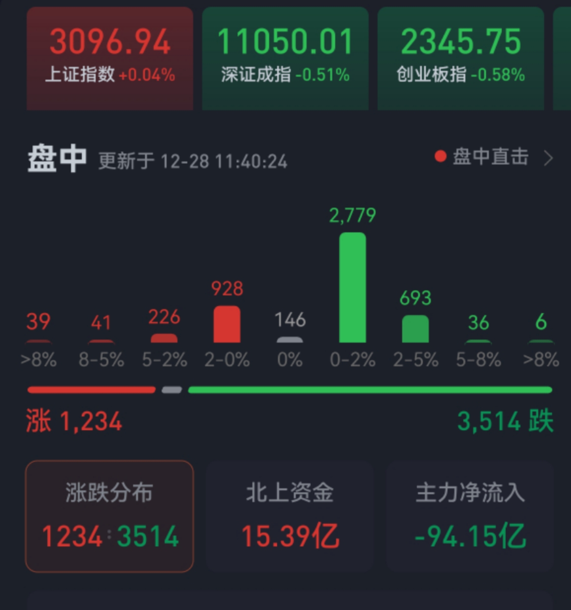 周三(12月28日),三大股指繼續(xù)震蕩分化。截至上午收盤,上證指數(shù)漲0.04%,報3096.94點,逼近3100點關口;深證成指跌幅為0.51%,創(chuàng)業(yè)板指跌幅為0.58%;滬深兩市合計成交額4116.6億元,總體來看,兩市個股跌多漲少,其中,漲停個股達28只,跌停7只。