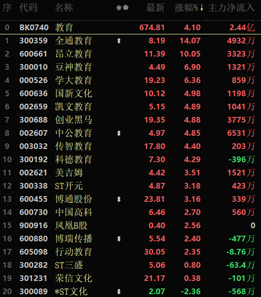 從早盤(pán)表現(xiàn)強(qiáng)勢(shì)的教育行業(yè)看,交易中的20只成份股有19只上漲,其中4只漲幅超5%。資金流向看,教育行業(yè)大單資金凈流入額為2.44億元,居行業(yè)第8位,排名第一的證券行業(yè),大單資金凈流入額為14.0億元。