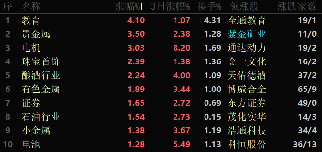東方財(cái)富行業(yè)方面,截至1月9日11:30,86類行業(yè)中77類上漲,占比89.53%,其中,教育行業(yè)漲幅居首,達(dá)4.10%,此外,貴金屬和電機(jī)等2類行業(yè)漲幅均超3%。下跌方面,航天航空跌幅居首,達(dá)1.18%。