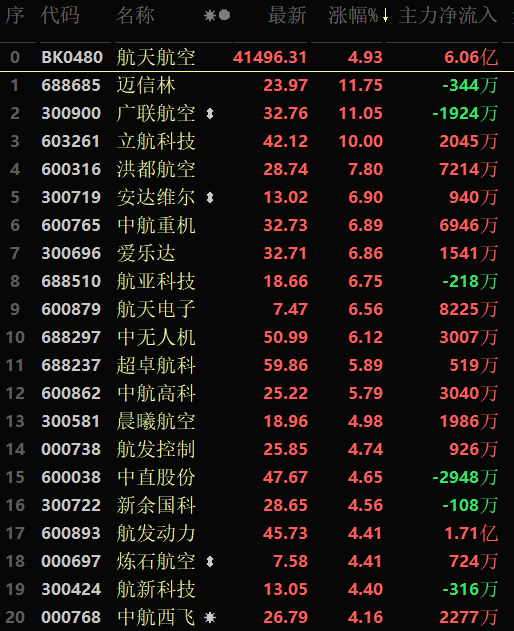 從早盤表現(xiàn)強(qiáng)勢(shì)的航天航空行業(yè)看,交易中的38只成份股全線上漲,其中立航科技封漲停板。資金流向看,航天航空行業(yè)大單資金凈流入額為6.06億元,居行業(yè)第7位。