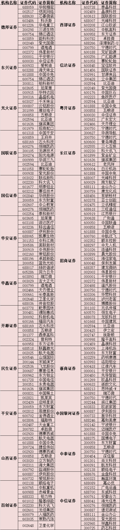 從券商推薦的181只金股看,有30只個股獲2家及以上券商推薦。其中,五糧液被招商證券、開源證券、山西證券、光大證券、中泰證券、粵開證券等6家券商共同選入2月份金股;中國中免也獲中國銀河證券、招商證券、山西證券、長江證券、東興證券、粵開證券等6家券商集體推薦;寧德時代贏得中國銀河證券、招商證券、信達(dá)證券、中泰證券、長江證券、粵開證券共6家券商聯(lián)合推薦;比亞迪也獲招商證券、信達(dá)證券、國聯(lián)證券、光大證券、粵開證券等5家券商共同選入2月份金股。另外,東方財富、平安銀行、恒瑞醫(yī)藥、伊利股份、旗濱集團(tuán)、科大訊飛等6只個股也受到3家券商推薦。