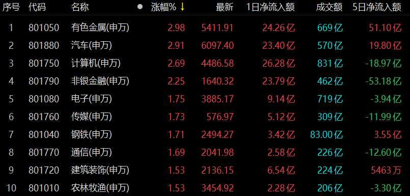 2月1日,行業(yè)板塊呈普漲格局。從31類申萬一級行業(yè)看,有29類行業(yè)上漲,占比93.55%,2類行業(yè)下跌。漲幅方面,有色金屬行業(yè)居首達(dá)2.98%,大單資金凈買入24.26億元,此外,汽車、計算機(jī)和非銀金融漲幅也均超2%。跌幅方面,僅銀行和房地產(chǎn)下跌,跌幅分別為0.53%和0.30%。