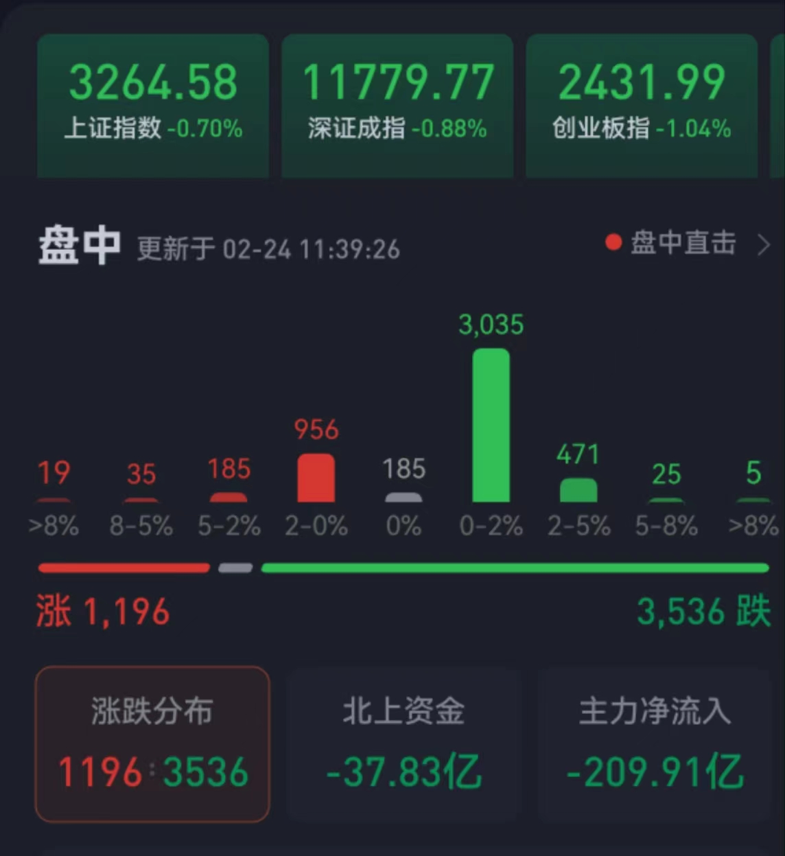 周五(2月24日),三大股指震蕩回落,全線下跌。截至上午收盤,上證指數(shù)跌幅達(dá)0.70%,報(bào)3264.58點(diǎn);深證成指和創(chuàng)業(yè)板指跌幅分別為0.88%和1.04%;滬深兩市合計(jì)成交額4576.6億元,總體來看,兩市個(gè)股跌多漲少。其中,漲停個(gè)股達(dá)10只,跌停個(gè)股達(dá)3只。