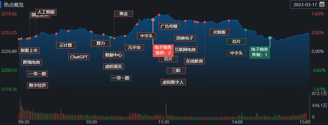3月17日,滬深兩市三大指數(shù)震蕩分化,滬指日K線走出長上影的仙人指路形態(tài),深證成指則連續(xù)兩天收盤處于半年線之下。截至收盤,上證指數(shù)漲0.73%報3250.55點;深證成指漲0.36%報11278.05點,創(chuàng)業(yè)板指跌0.36%報2293.67點,A股合計成交額9734.32億元,較前一交易日增長15.14%,北向資金凈買入71.83億元,滬股通凈買入11.45億元,深股通凈買入60.37億元??傮w上看,A股中漲多跌少,有3220只上漲,1696只下跌。