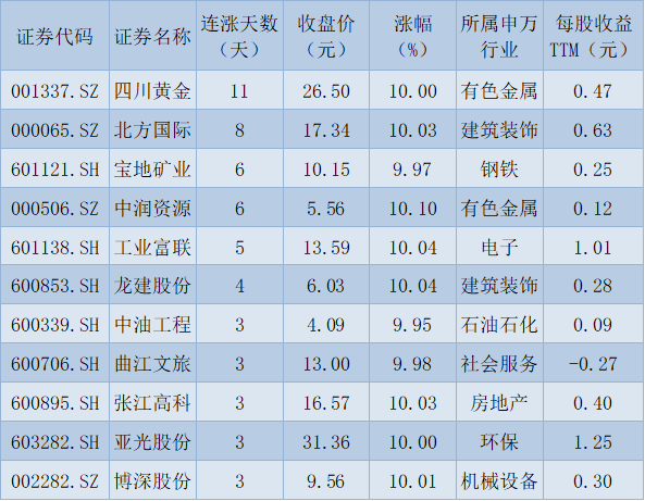 表:連續(xù)上漲3日且今日收盤漲停股一覽