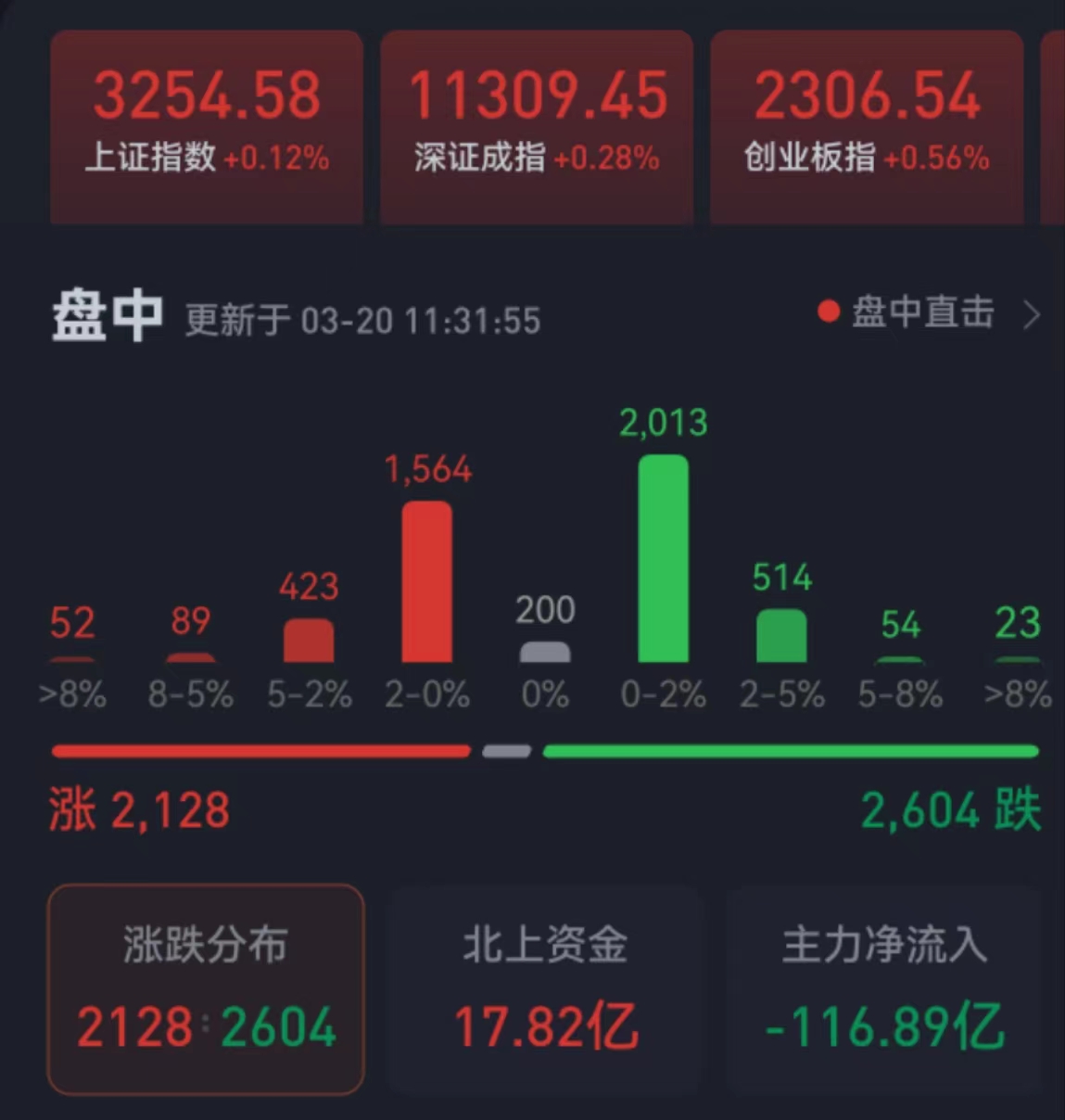 周一(3月20日),三大股指震蕩攀升,全線飄紅。截至上午收盤,上證指數(shù)漲幅達(dá)0.12%,報(bào)3254.58點(diǎn);深證成指和創(chuàng)業(yè)板指漲幅分別達(dá)0.28%和0.56%;滬深兩市合計(jì)成交額7048.7億元。
