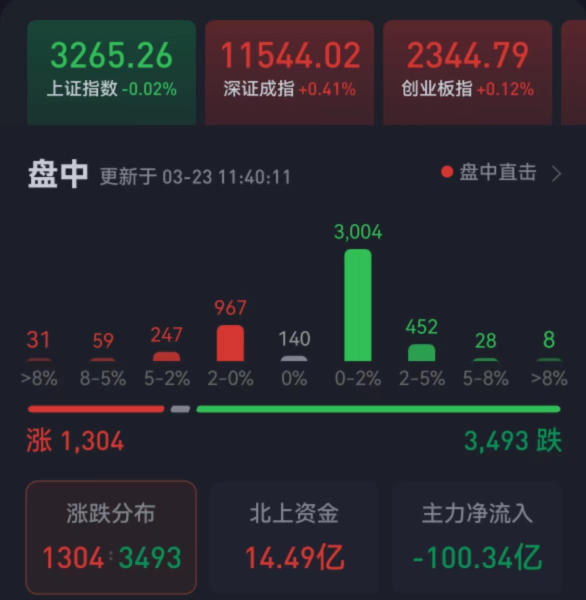 周四(3月23日),三大股指繼續(xù)震蕩分化,漲跌不一。截至上午收盤(pán),上證指數(shù)跌幅0.02%,報(bào)3265.26點(diǎn);深證成指和創(chuàng)業(yè)板指漲幅分別為0.41%和0.12%;滬深兩市合計(jì)成交額6040.9億元,總體來(lái)看,兩市個(gè)股跌多漲少。