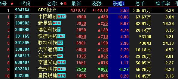 具體看,截至3月23日上午收盤(pán),CPO概念板塊再度上行,漲幅居首達(dá)3.53%。其中,中際旭創(chuàng)漲幅超10%。