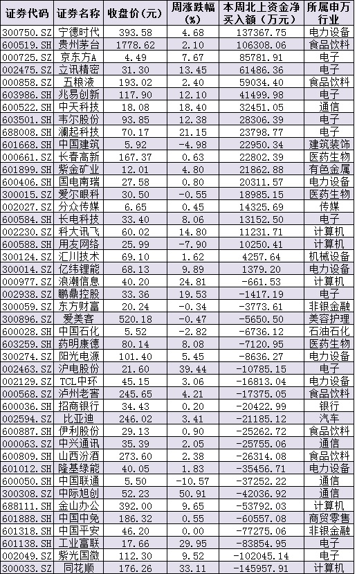 資金方面,本周北向資金累計凈買入金額達(dá)109.50億元。從前十大成交活躍股來看,本周,寧德時代、貴州茅臺等2只個股,北向資金凈買入金額均超10億元。另外,同花順、紫光國微等個股遭北向資金凈賣出金額均超10億元。
