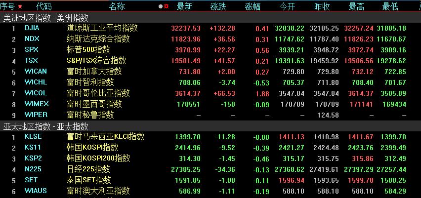 周五,美國三大股指全線收漲,道指漲0.41%報32237.53點,標(biāo)普500指數(shù)漲0.56%報3970.99點,納指漲0.31%報11823.96點。本周,道指漲1.18%,標(biāo)普500指數(shù)漲1.39%,納指漲1.66%。