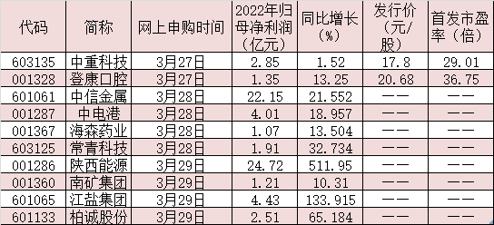 3月27日,首批滬深主板注冊(cè)制新股正式開始網(wǎng)上申購(gòu)。首批10只滬深主板注冊(cè)制新股,中重科技、登康口腔在本周一(3月27日)申購(gòu);中電港、常青科技、中信金屬、海森藥業(yè)將在本周二(3月28日)申購(gòu);柏誠(chéng)股份、江鹽集團(tuán)、南礦集團(tuán)、陜西能源將在本周三(3月29日)申購(gòu)。