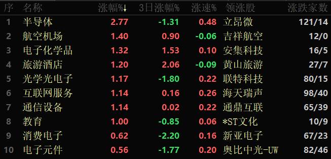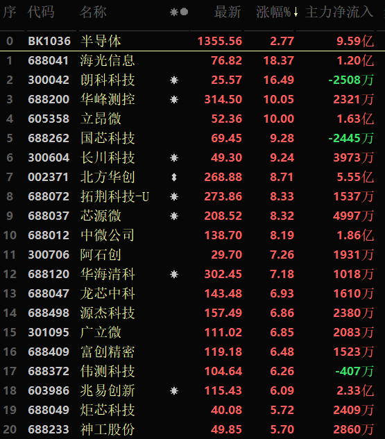 從早盤表現(xiàn)強(qiáng)勢(shì)的半導(dǎo)體行業(yè)看,該行業(yè)交易中的135只成份股中有121只上漲,其中,有23只個(gè)股漲幅超5%。資金方面,有9.59億元大單資金凈流入該行業(yè),居各行業(yè)資金凈流入排名第1位。