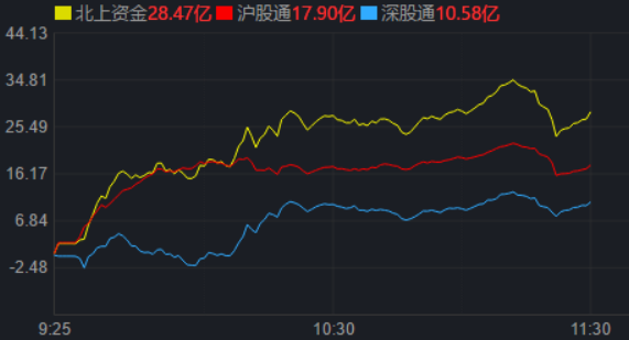 從資金面來看,3月29日上午,北上資金凈買入金額達(dá)28.47億元,其中,滬股通凈買入17.90億元,深股通凈買入10.58億元。