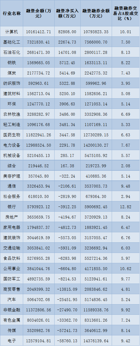表:3月29日申萬一級(jí)行業(yè)兩融交易情況: