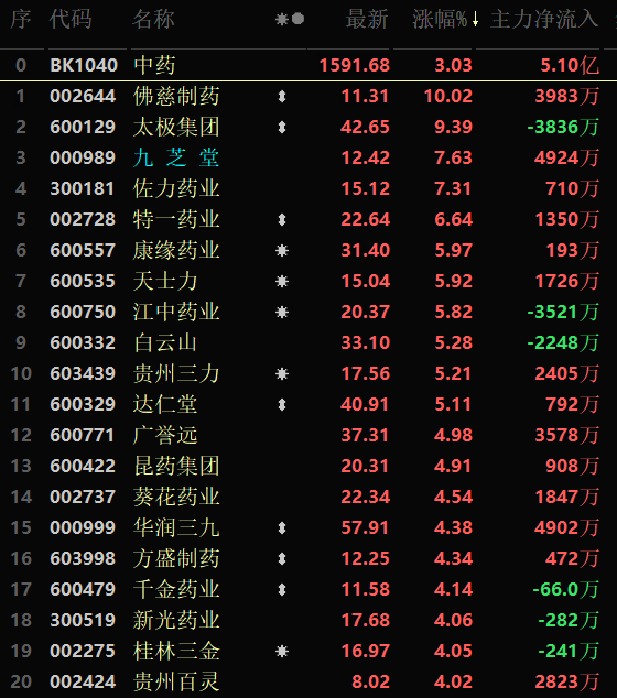 從早盤表現(xiàn)強勢的中藥行業(yè)看,該行業(yè)交易中的73只成分股中有70只上漲,其中,有11只個股漲幅超5%。資金方面,有5.10億元大單資金凈流入該行業(yè),居各行業(yè)第3位。