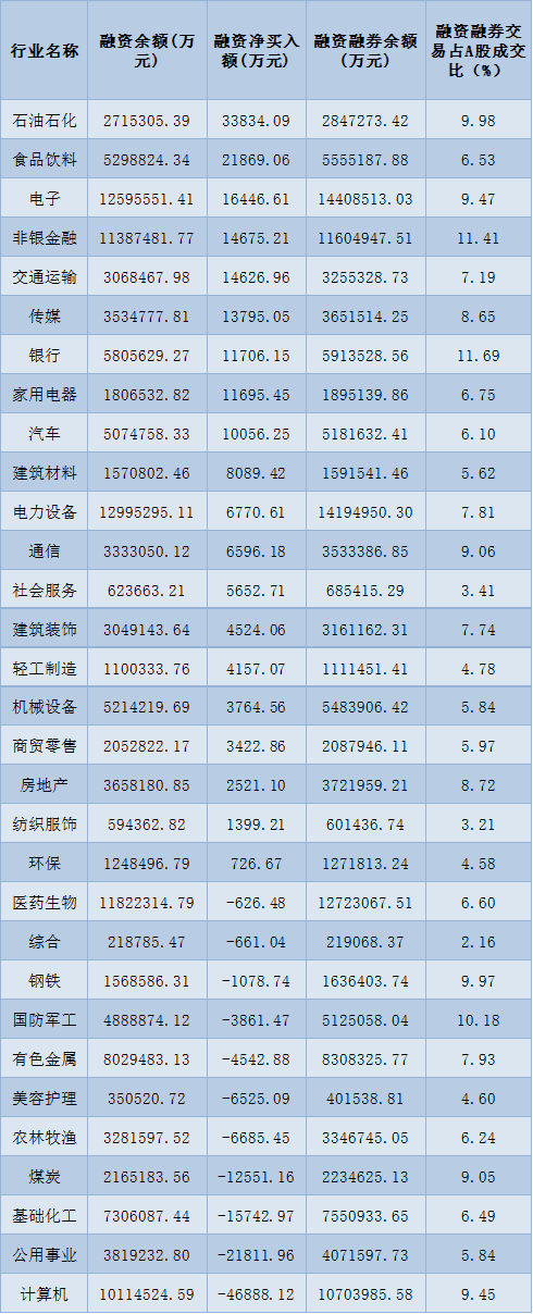 表:3月30日申萬一級行業(yè)兩融交易情況: